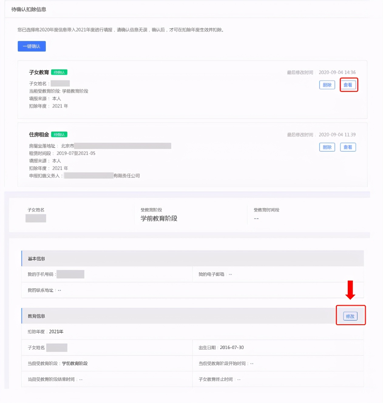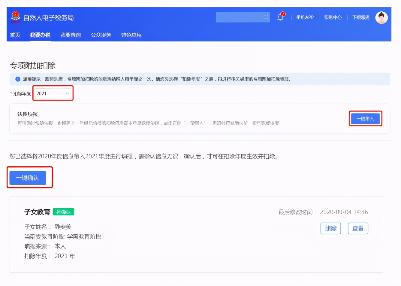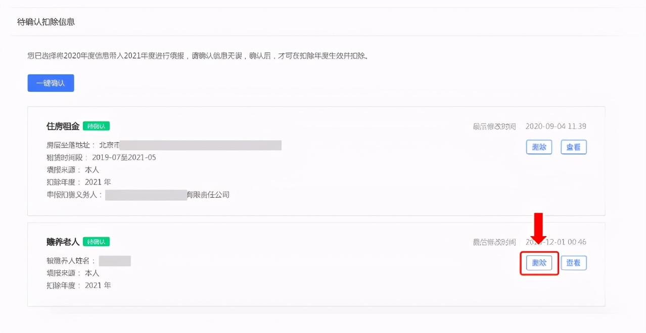 打开“待确认”状态的专项附加扣除,核对信息;如有修改,可以点击“修改”,信息确认后点击“一键确认”。如上图5、6。注意:如有“已失效”状态的信息,则需先删除之后才能点击“一键确认”。