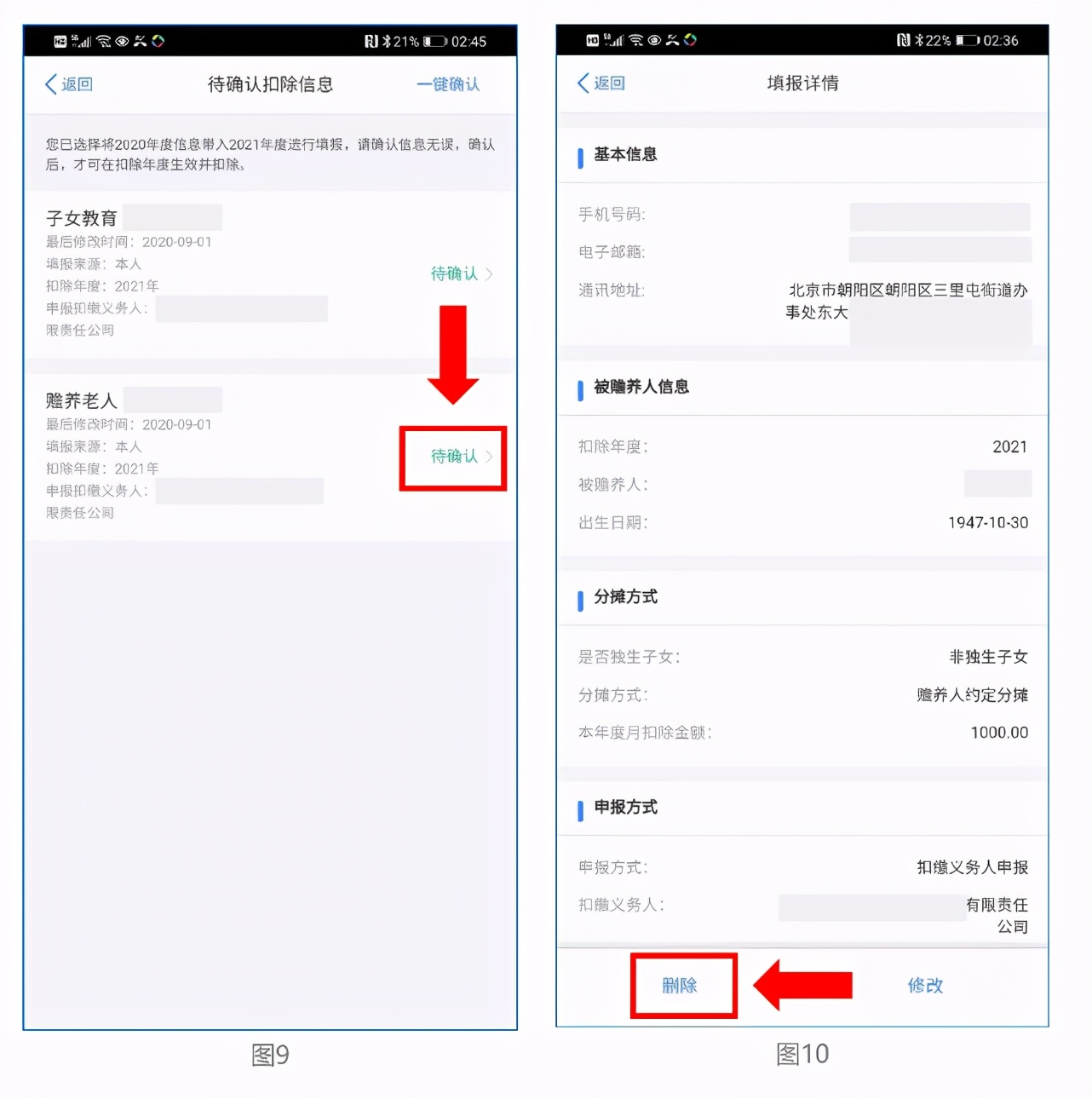 点击“待确认”状态的赡养老人信息,点击“删除”,再点击“一键确认”。如上图9、图10。