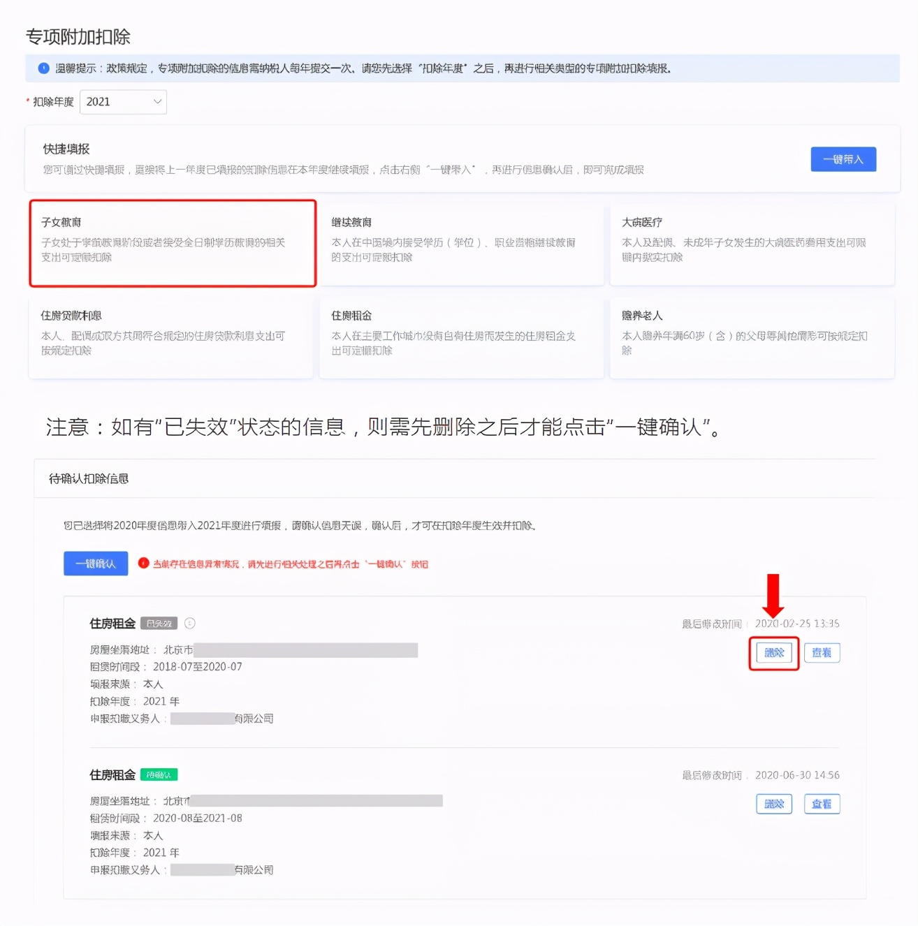 注意:如有“已失效”状态的信息,则需先删除之后才能点击“一键确认”。