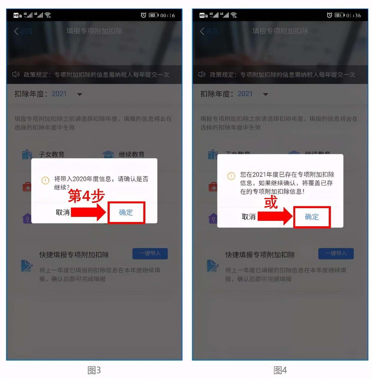 依据提示“将带入2020年度信息,请确认是否继续?”或者“您在2021年度已存在专项附加扣除信息,如果继续确认,将覆盖已存在的专项附加扣除信息!”,确认后点击“确定”,如上图3、4。