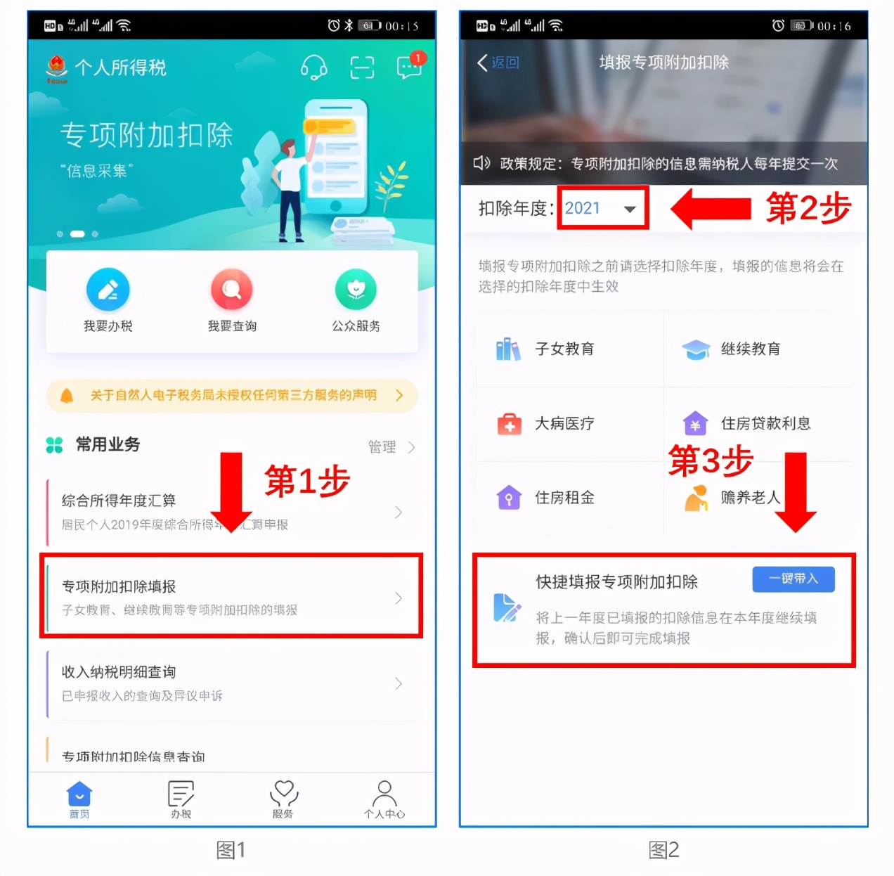 打开个人所得税APP-首页-“专项附加扣除填报”-选择“扣除年度”——“一键带入”如上图1、2。
